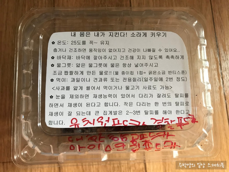 소라게가 들어 있는 통에는 키우는 방법이 적혀 있었고, 도담이가 소라게 이름도 적어 놓았다.