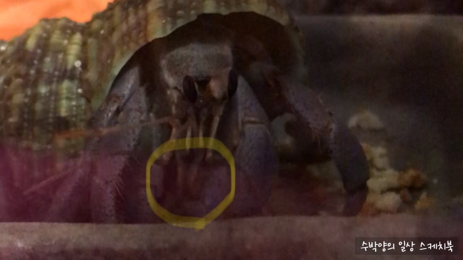 먹이 그릇 안에서 꼬물거리는 소라게 발견!!!