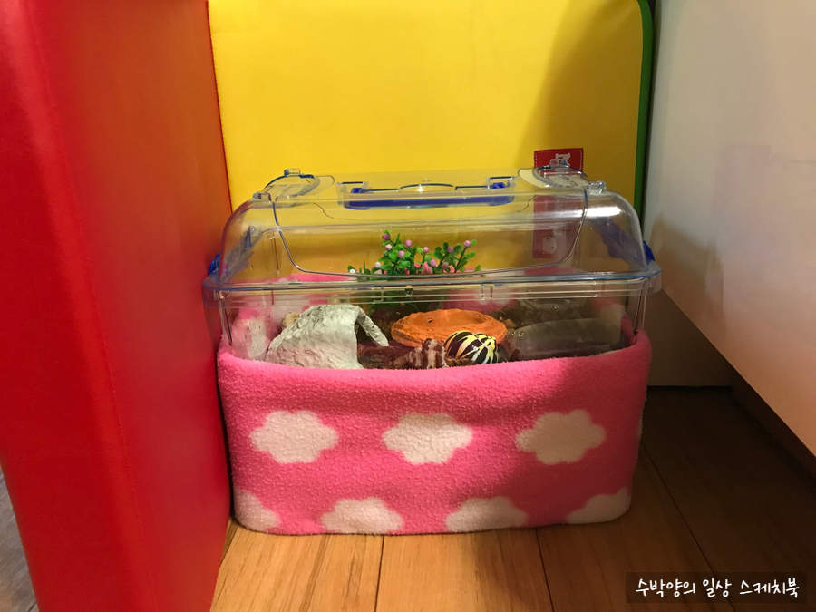 사육장을 담요로 감싸 따뜻한 바닥에 두었고